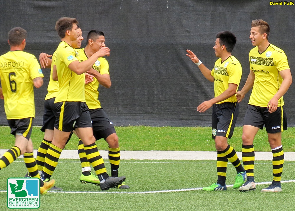 Two teams searching for their first win of the season battled it out under sunny Mothers Day skies. Early on Wenatchee FC showed they wanted the three points. Galvan’s first goal came only three-plus minutes into the match. He finished a through ball from Eduardo Perez in tight quarters around the left side of the six yard box.