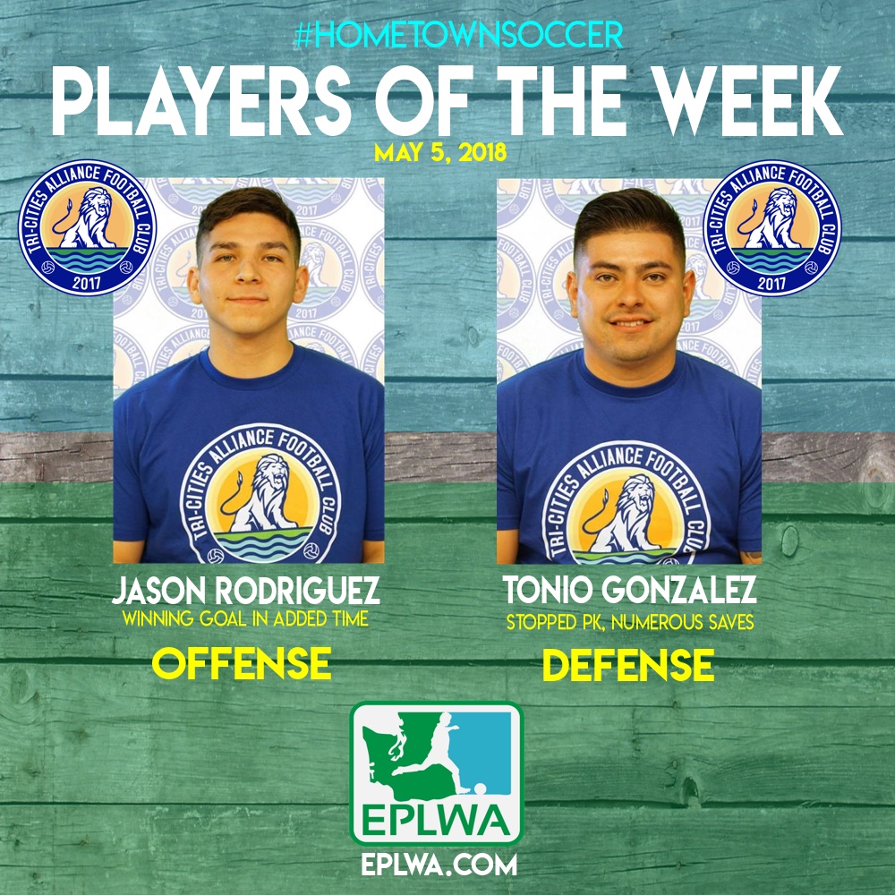 The Evergreen Premier League today announces the honorees of the first week of play with the #HometownSoccer Players of the Week awards for May 5, 2018. Tri-Cities Alliance FC midfielder Jason Rodriguez (offense) and goalkeeper Tonio Gonzalez (defense) were voted by league head coaches and general managers as worthy of note for their standout contributions in TCAFC’s 3-2 away win at Spokane Shadow.